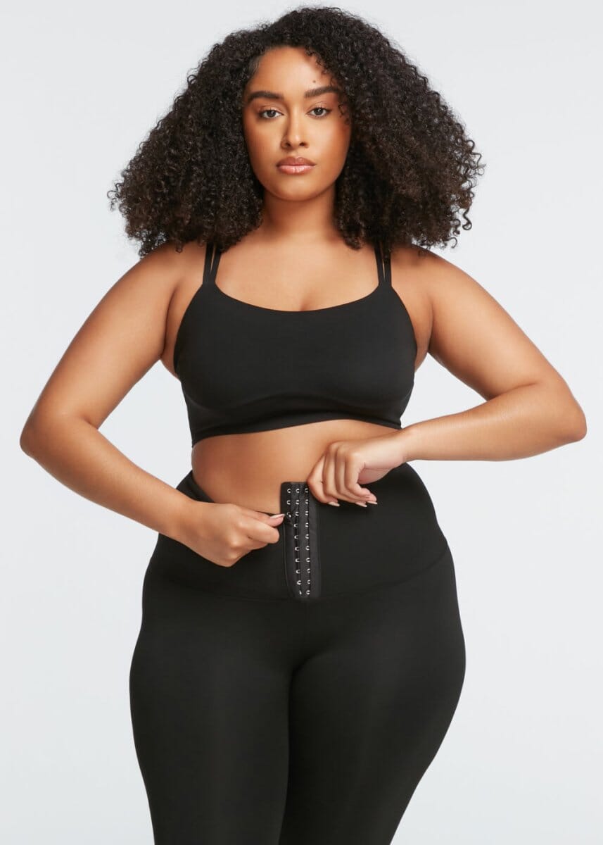 These leggings are a blend of a workout leggings combined with shapewear and a waist trainer. They feature a high compression fabric to accentuate your curves and the unique high waist design has a an abdominal belt with several rows of clips that are adjustable to your level of compression to smooth and flatten your tummy.