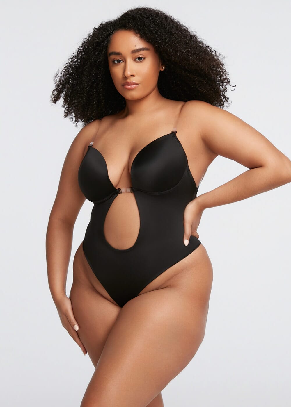 This is the ultimate bra and shapewear undergarment for backless and low cut plunge dresses. This is the hidden secret to make your bust and curves look amazing under those challenging outfits. It features adjustable clear plastic straps and a thong bottom.
